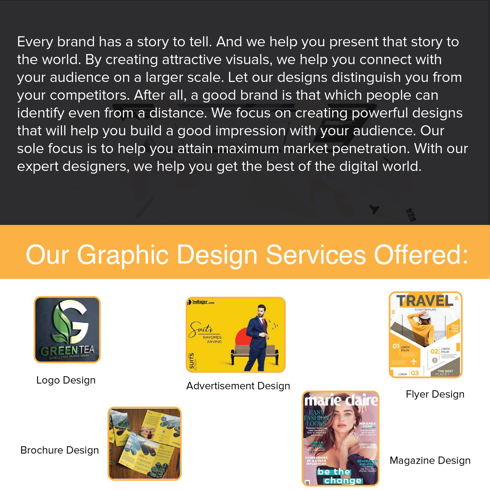 Every brand has a story to tell. And we help you present that story to the world. By creating attractive visuals, we help you connect with your audience on a larger scale. Let our designs distinguish you from your competitors. After all, a good brand is that which people can identify even from a distance. We focus on creating powerful designs that will help you build a good impression with your audience. Our sole focus is to help you attain maximum market penetration. With our expert designers, we help you get the best of the digital world.
